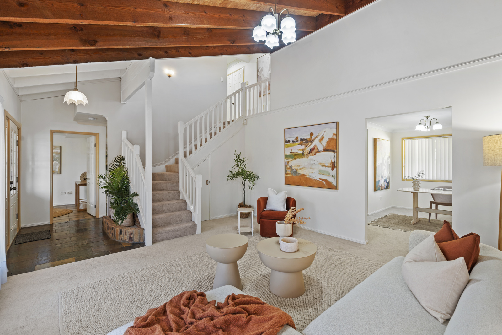 From the moment you step inside, the home makes a statement with soaring raked ceilings, exposed beams and an open staircase-creating a sense of space and character that’s hard to find.