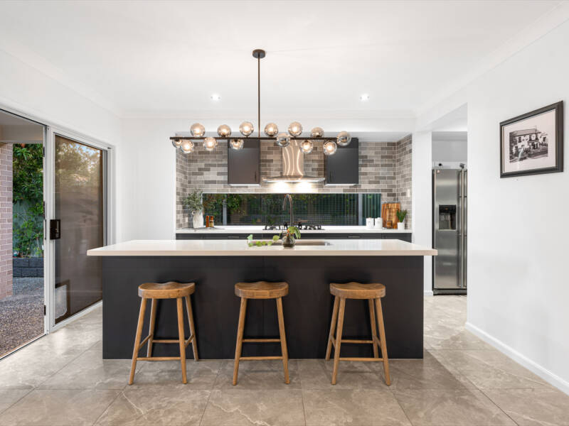 The heart of the home features a stunning chef's kitchen, complete with a central island bench under a stylish designer light, dazzling stone countertops, high-end stainless-steel appliances, five burner gas cooktop, plumbed fridge space and an elaborate butler's pantry-perfect for culinary adventures and hosting gatherings.