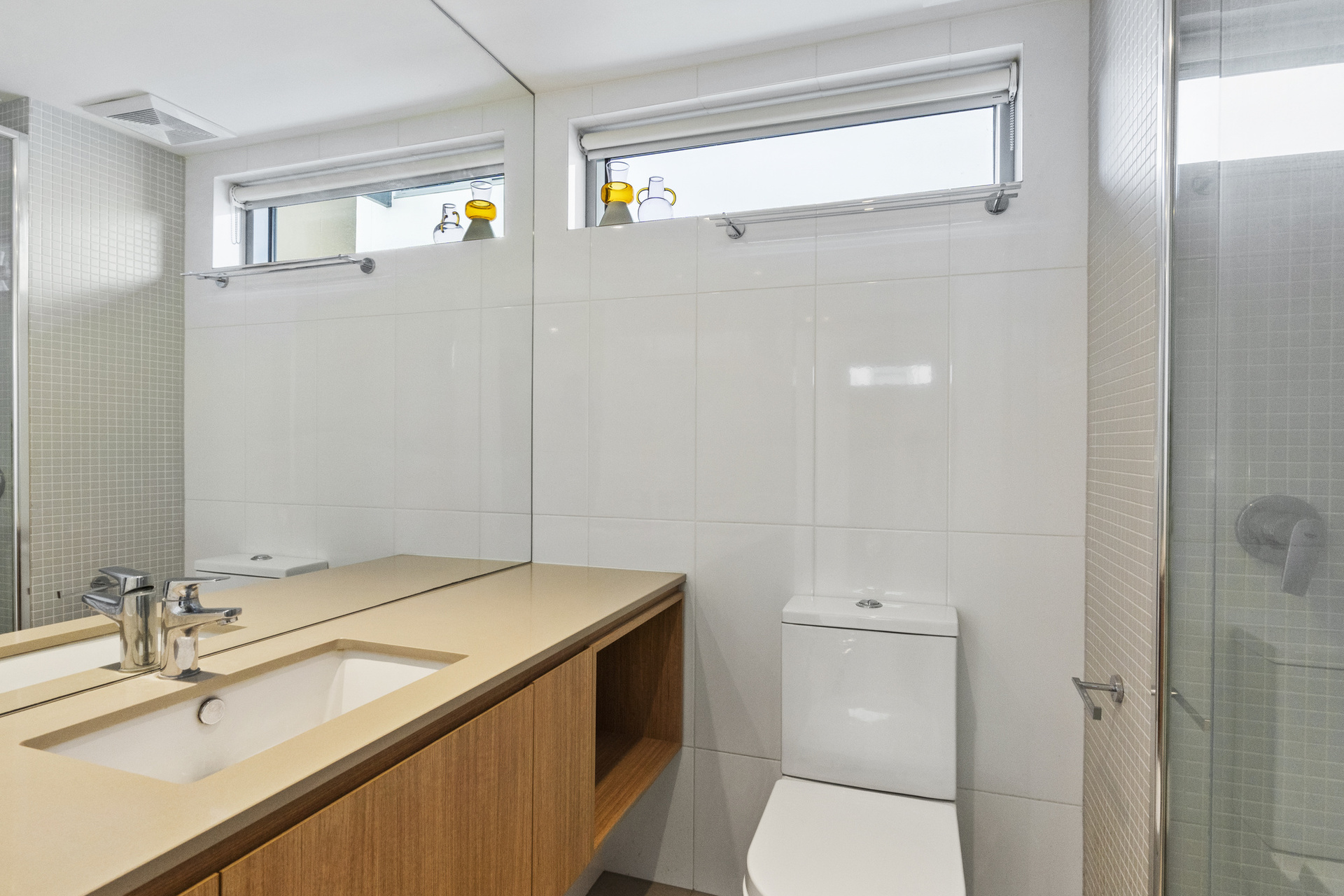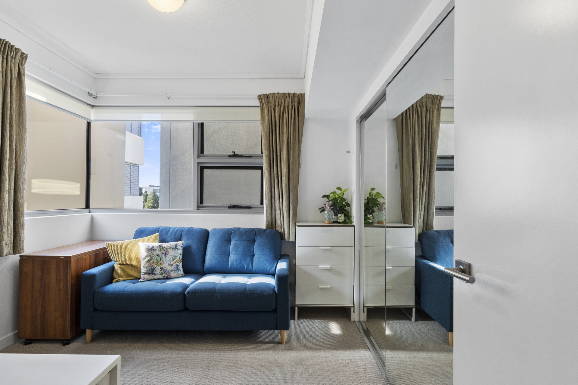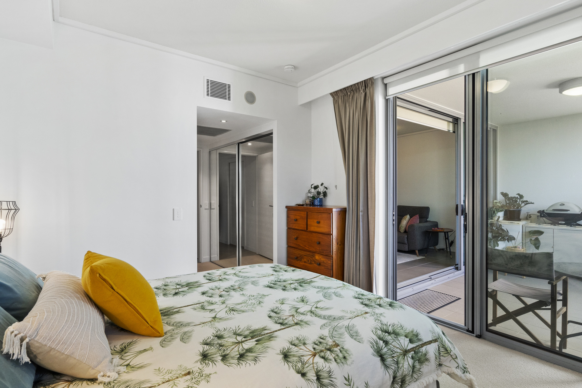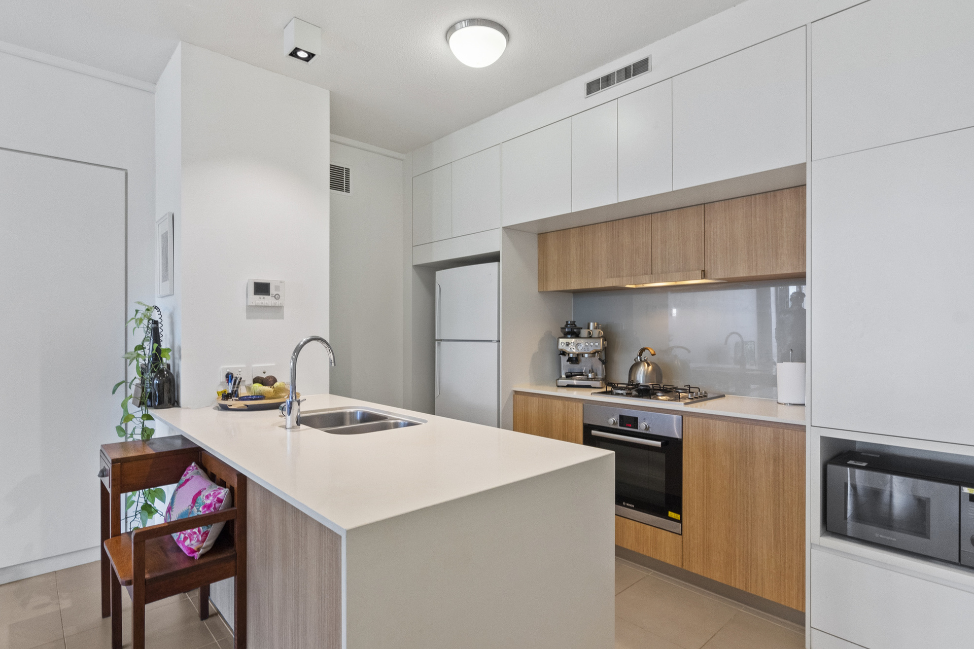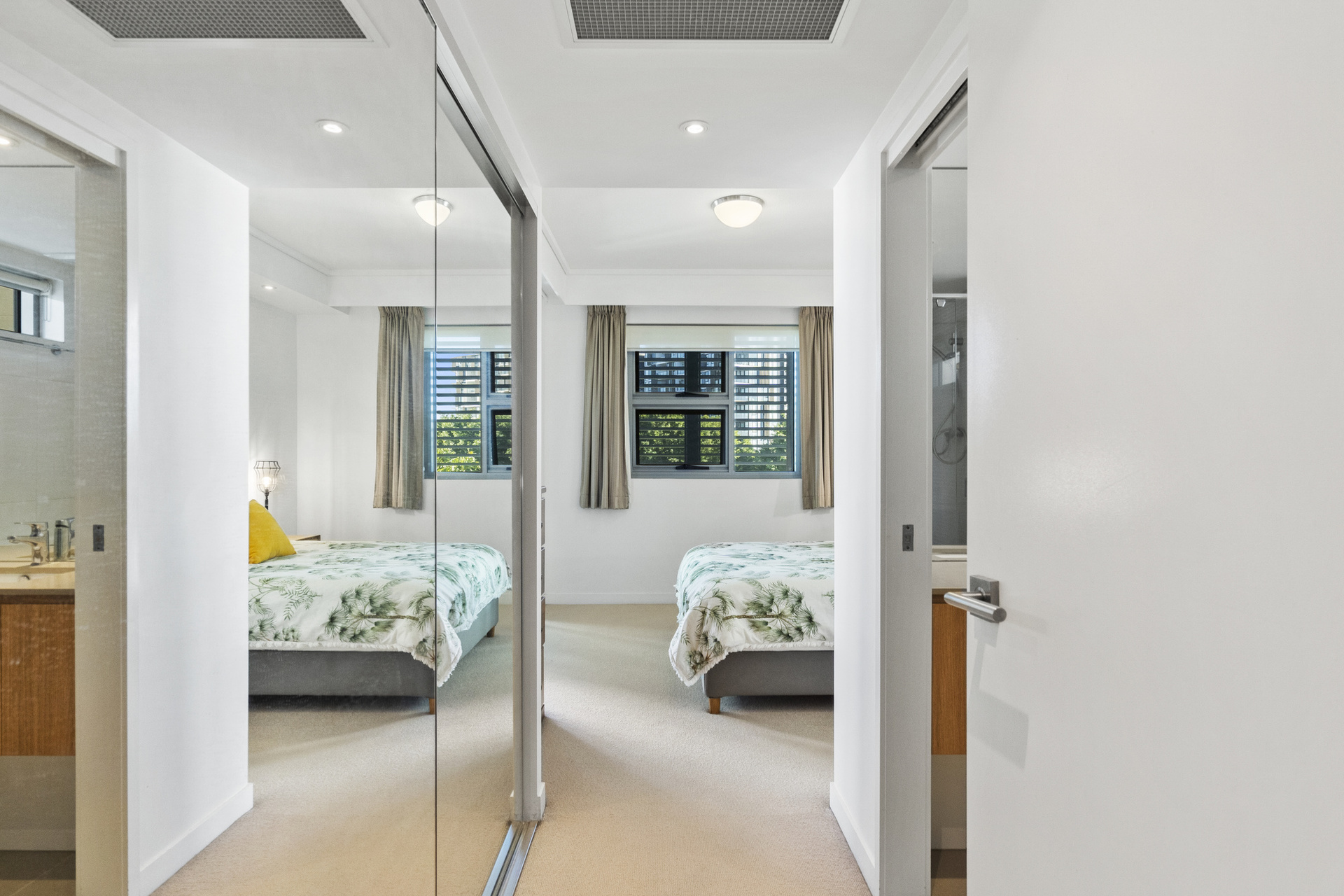 The master bedroom is generously sized with direct access to the balcony, complete with an ensuite bathroom and ample wardrobe space designed for two. The second bedroom provides flexibility as a guest room, study or children’s room. Fully air-conditioned throughout and equipped with a security intercom system along with fibre optic broadband connectivity, this home ensures comfort and convenience year-round. Two secure off-street parking spaces are included; one can be leased separately if desired.