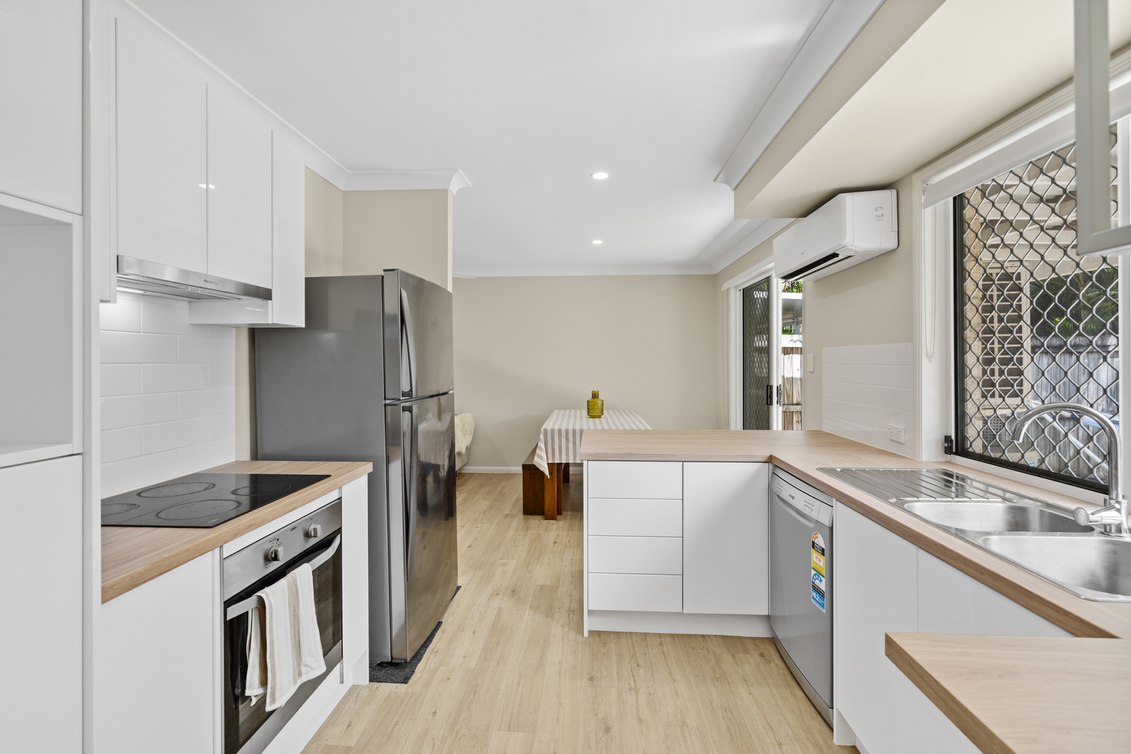Step inside to discover warm oak vinyl plank flooring flowing throughout the lower level, setting the tone for the open-plan living and dining space. The modern, renovated kitchen is both stylish and functional, complete with a 4-burner cooktop, rangehood, and ample storage, all enhanced by soft natural light from the private courtyard.