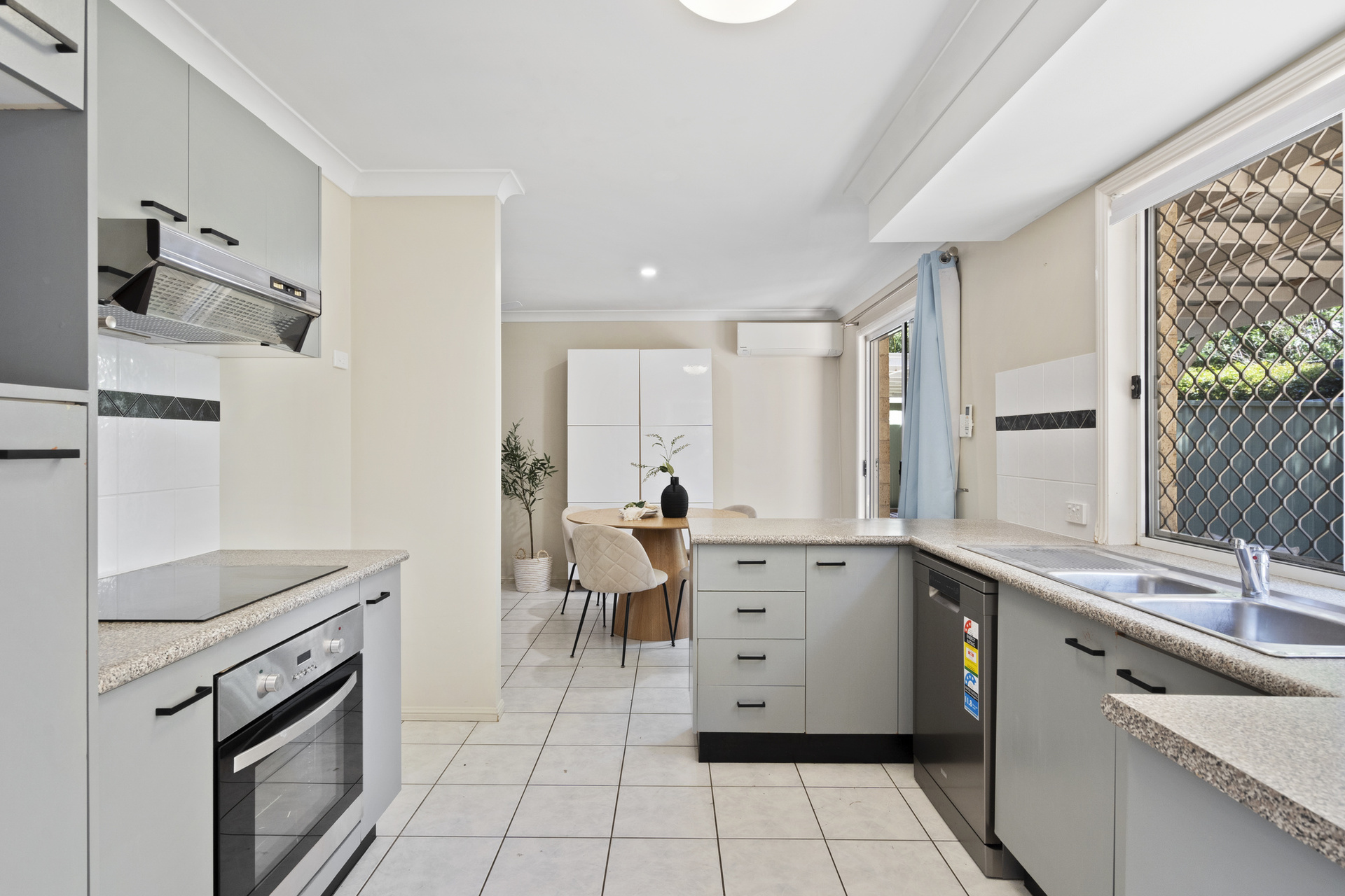 The home includes modern conveniences such as a four-burner electric cooktop with under-bench oven and range hood, Haier dishwasher, Panasonic air conditioning units in two bedrooms plus fans throughout the home for year-round comfort.
