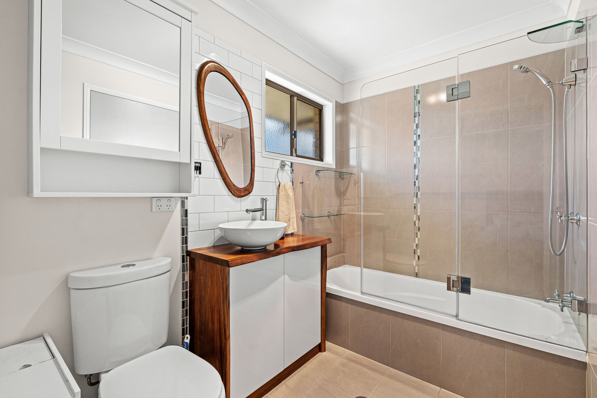 A well-appointed main bathroom including shower over bath with stainless steel tapware, single vanity and toilet.