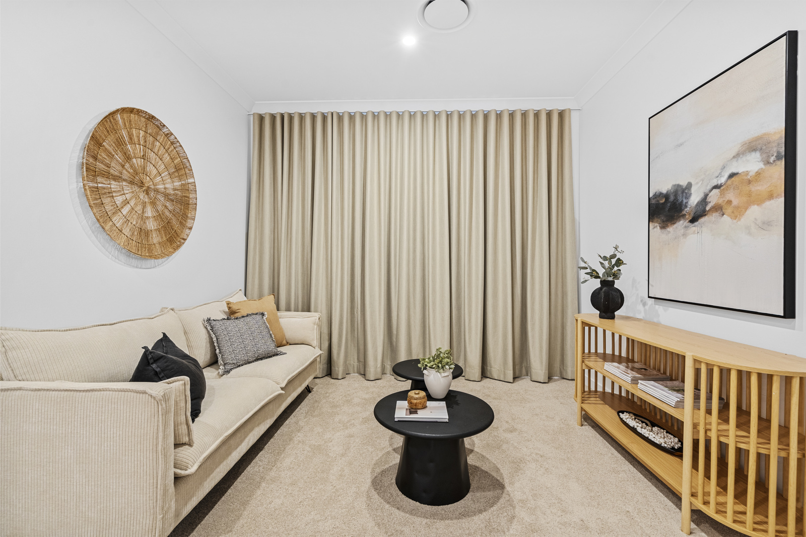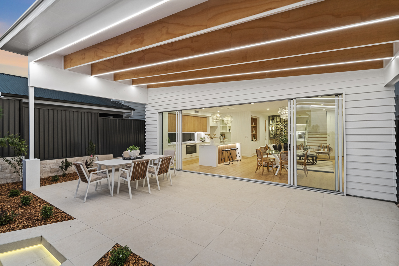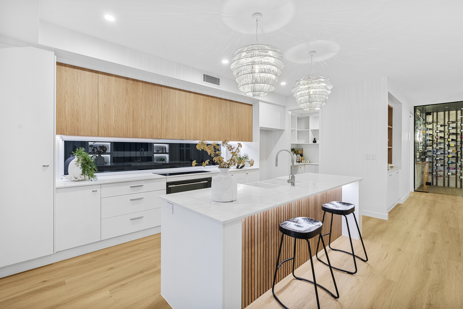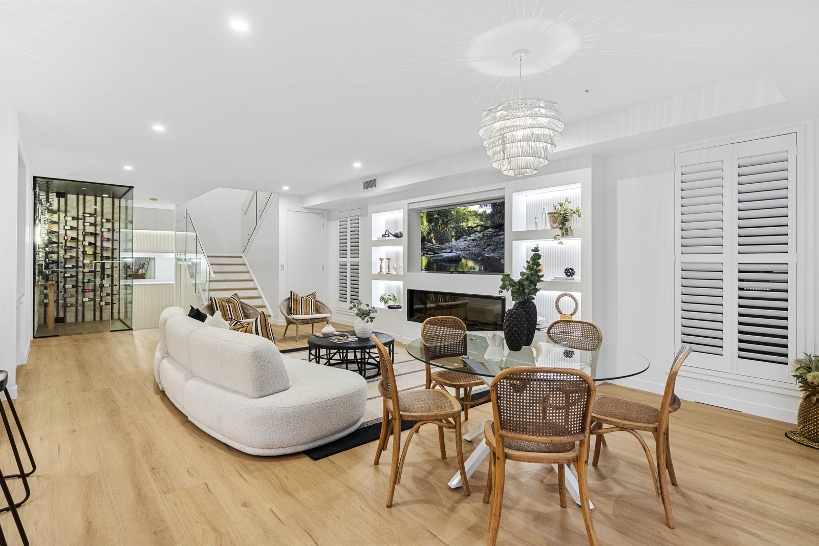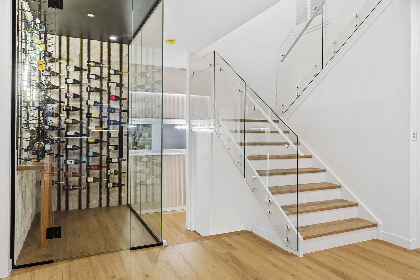 From the moment you step inside, the home opens into a light-filled living and dining space, framed by cool oak flooring and 2.7m ceilings, creating a sense of space and comfort. A striking feature wine cellar immediately catches your attention, offering ample storage for your treasured selection of wine, and to get you started the home even includes 50 bottles from the local Little Cedar Store.