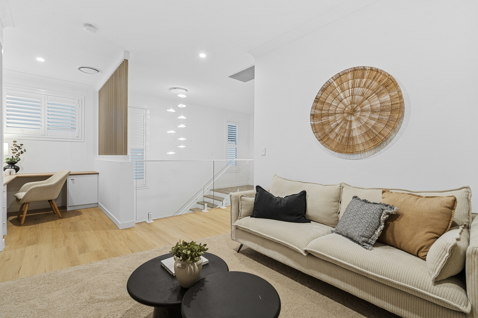 Upstairs has been thoughtfully designed for family living, offering four generous bedrooms, a study nook and a second living area, creating excellent separation between living and rest zones. Comfort throughout the home is enhanced with ducted air-conditioning, plantation shutters, ceiling fans, security screens and feature lighting, while soft-close cabinetry and built-in storage feature throughout the home.