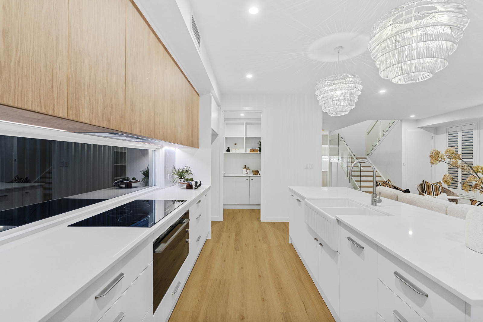 At the heart of the home is a designer kitchen by Larry McFarlin, complete with a stunning stone island bench and breakfast bar, butler’s pantry and premium Fisher & Paykel appliances, including a 90cm induction cooktop, oven, rangehood and integrated dishwasher. The kitchen and living spaces flow seamlessly through large sliding doors to the covered alfresco entertaining area, finished with a beautiful timber-beamed skillion ceiling.