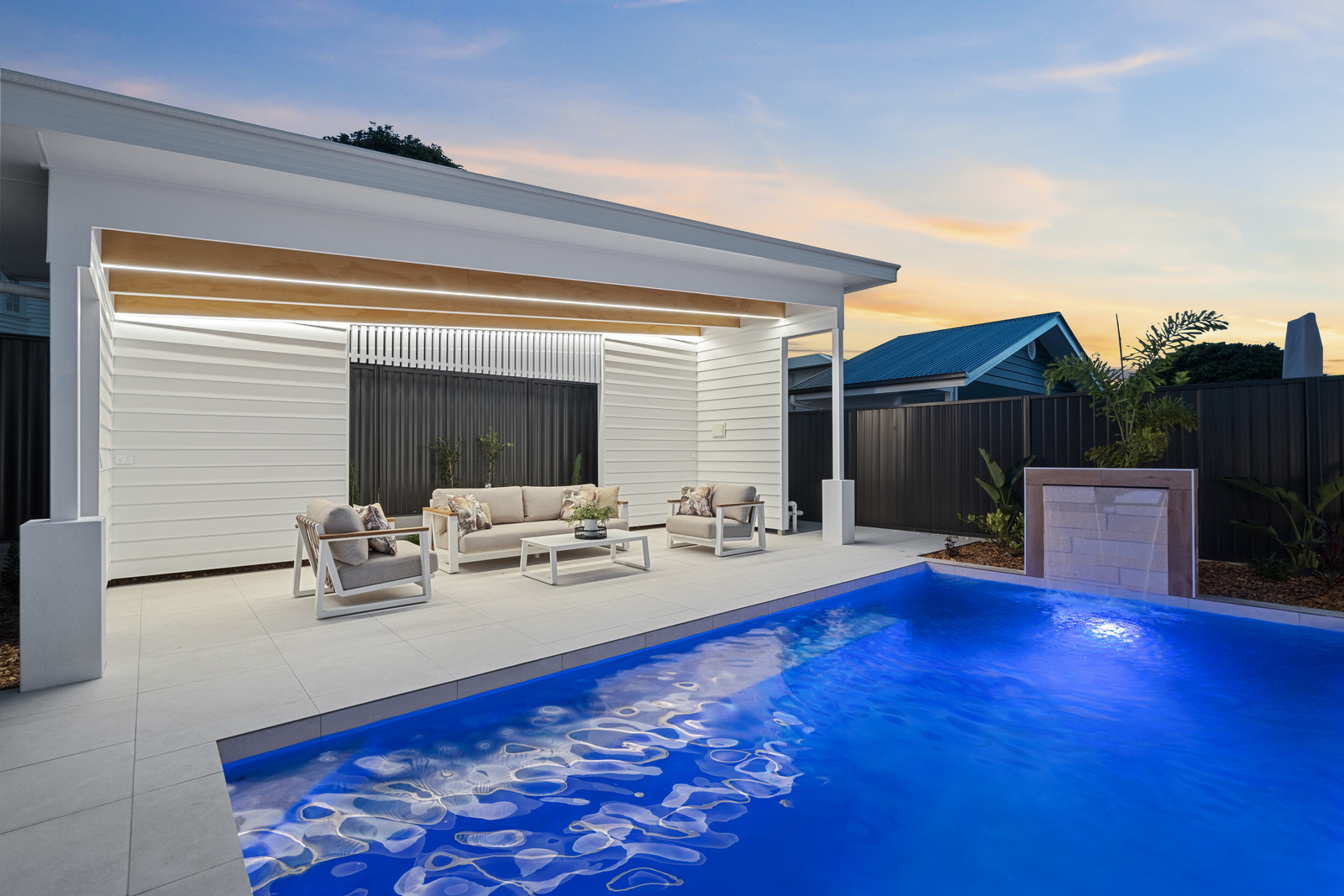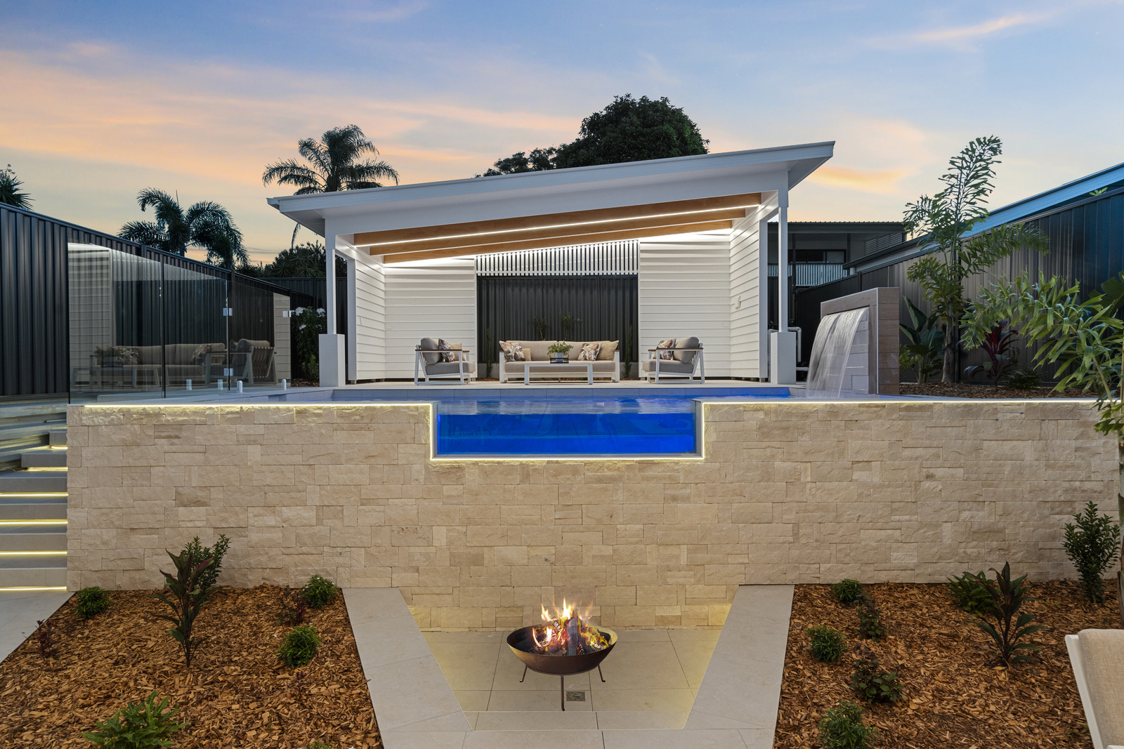 From here you look out over the magnesium heated swimming pool, framed by feature stonework and a striking glass window, with an additional poolside retreat providing another space to relax or entertain guests.