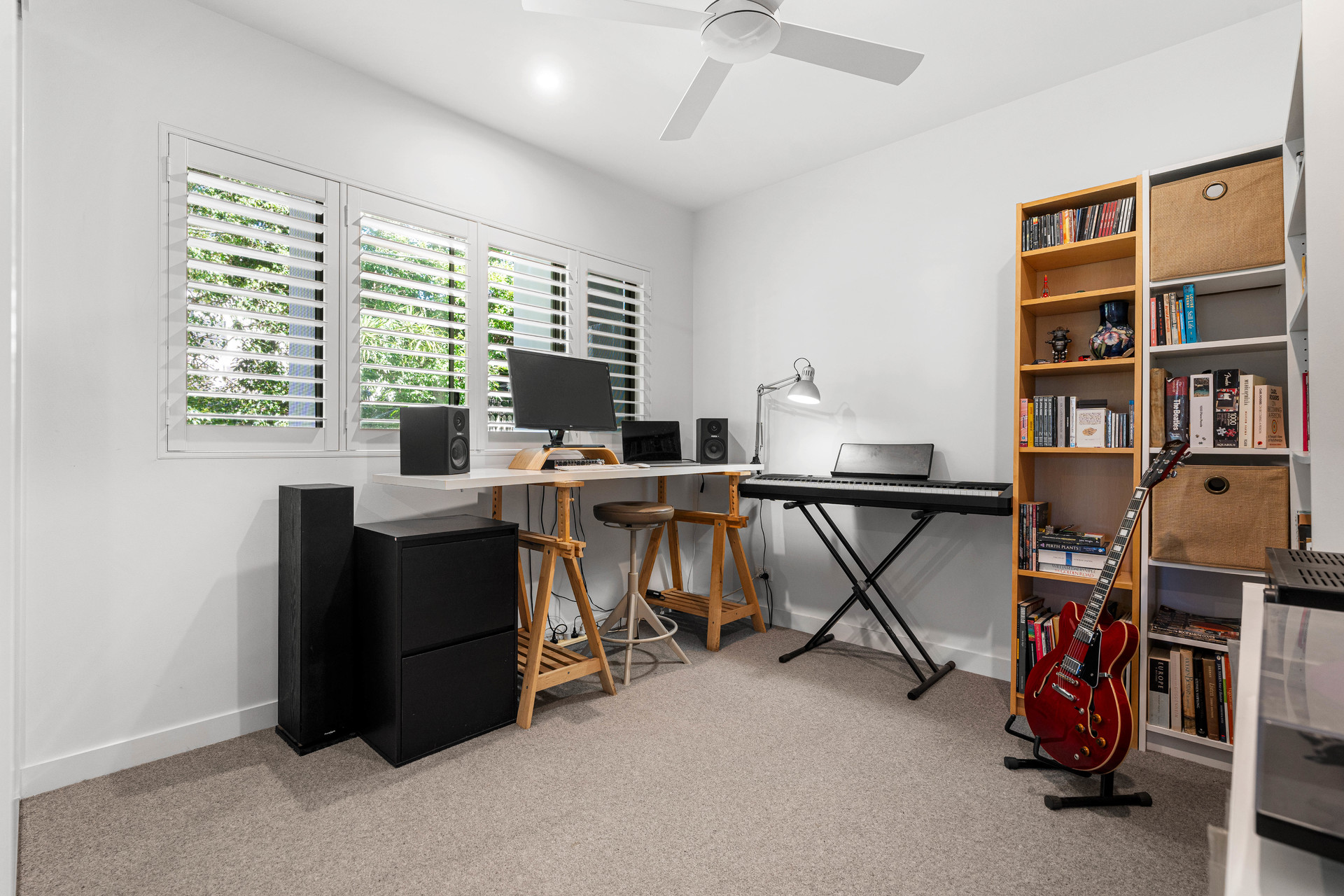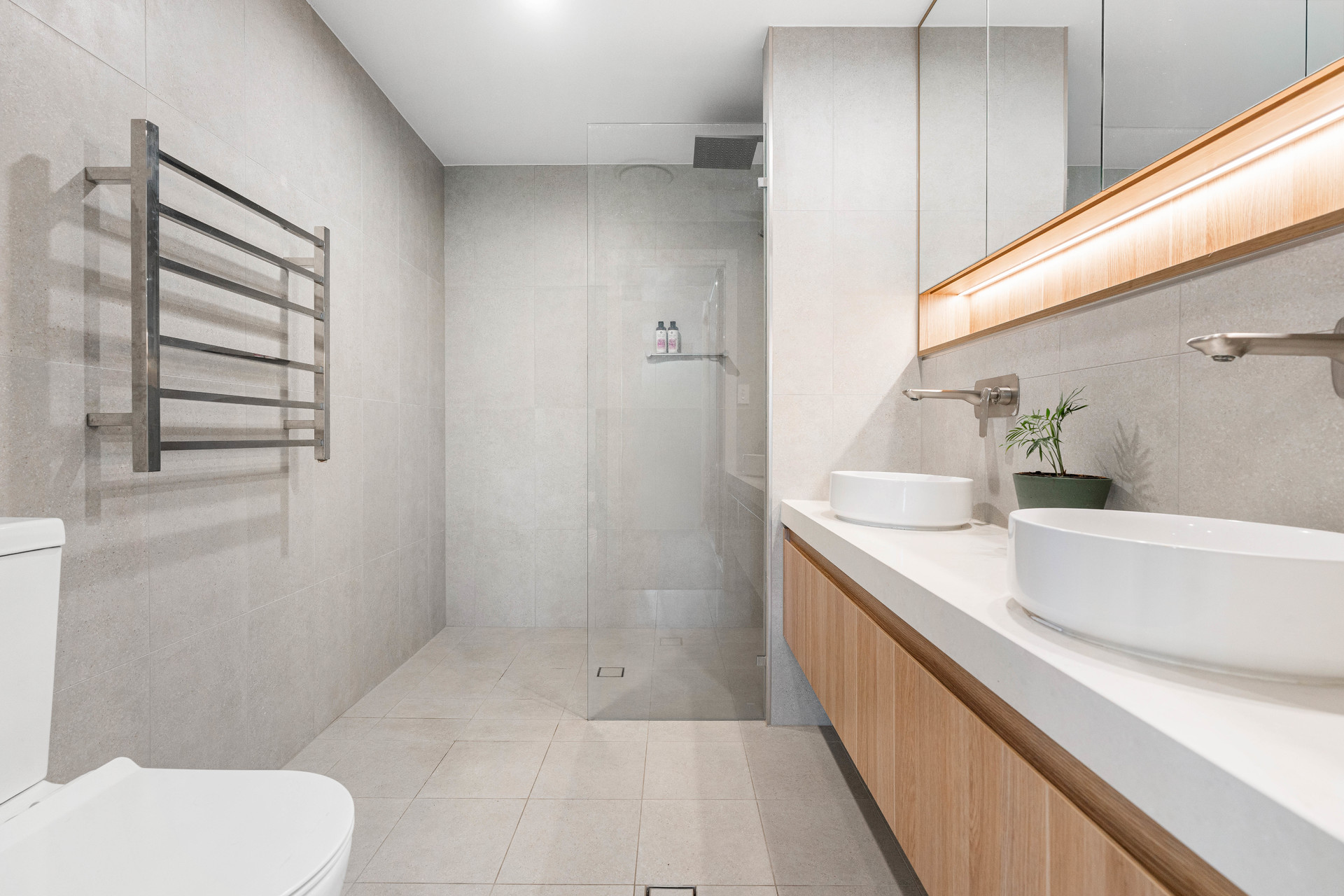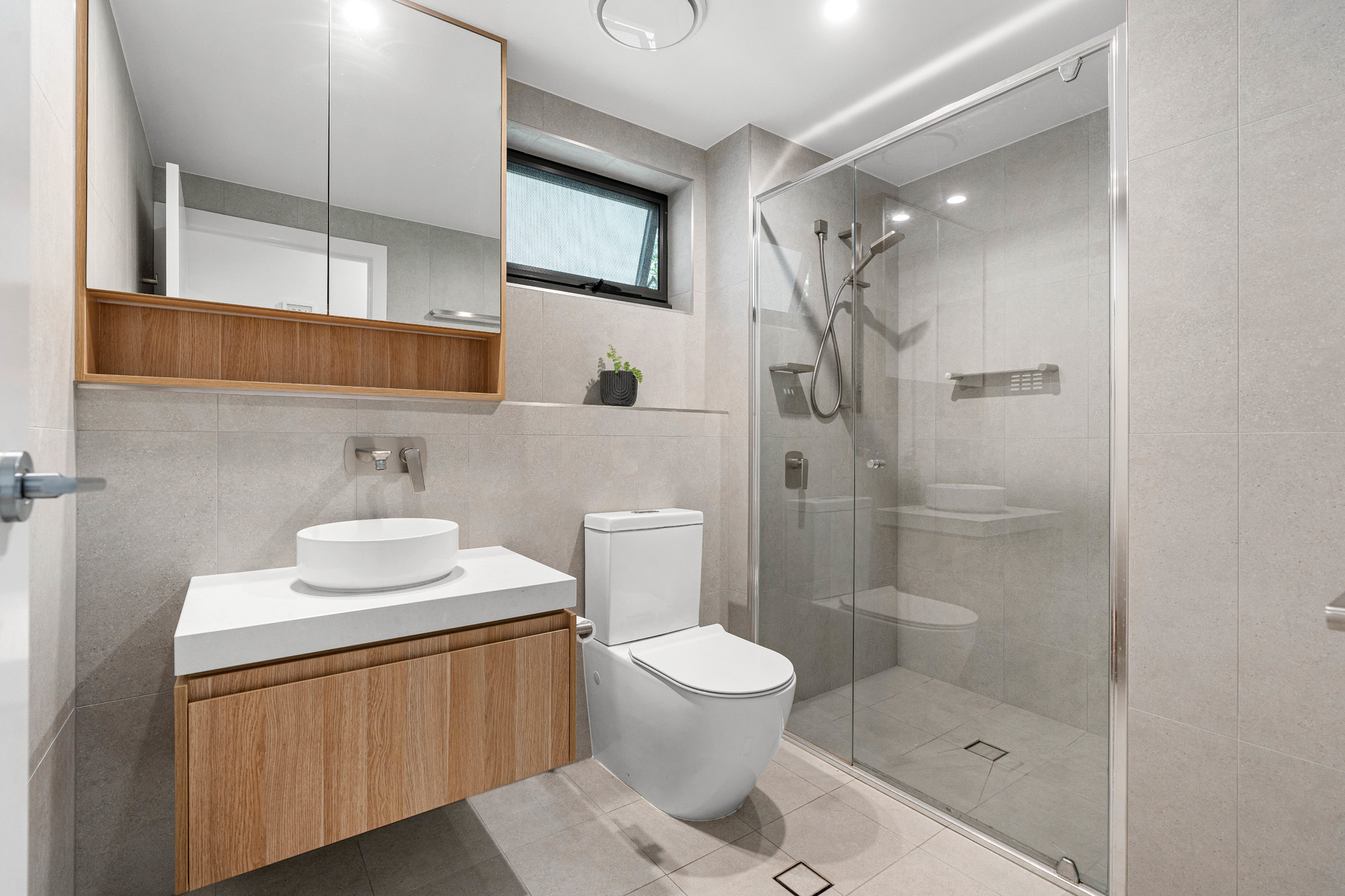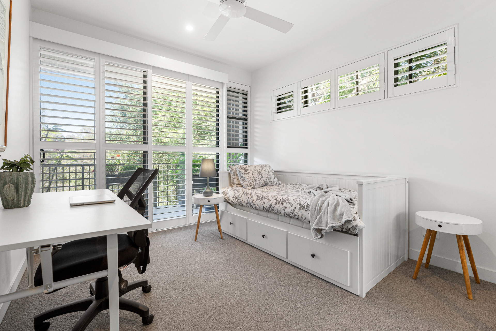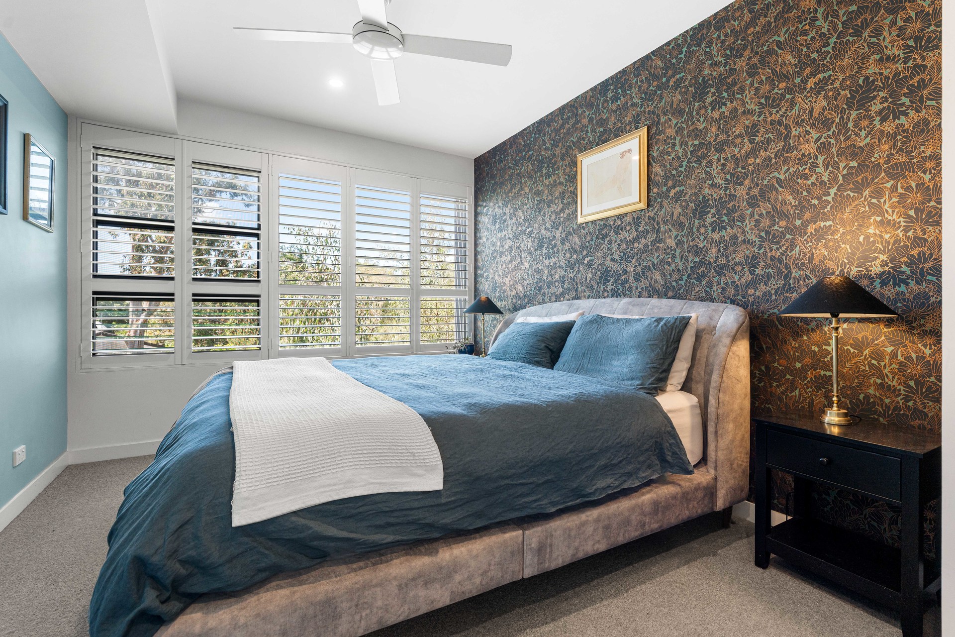 The master bedroom is flooded with natural light and has a wonderful green backdrop via plantation shutters. Generous in size with feature walls, built-in his and hers robe and ceiling fan. The luxurious ensuite is finished with high quality brushed metal fixtures and fittings, full wall to floor tiles, high flow rainfall shower head and frameless glass shower screen and walk-in shower cavity.