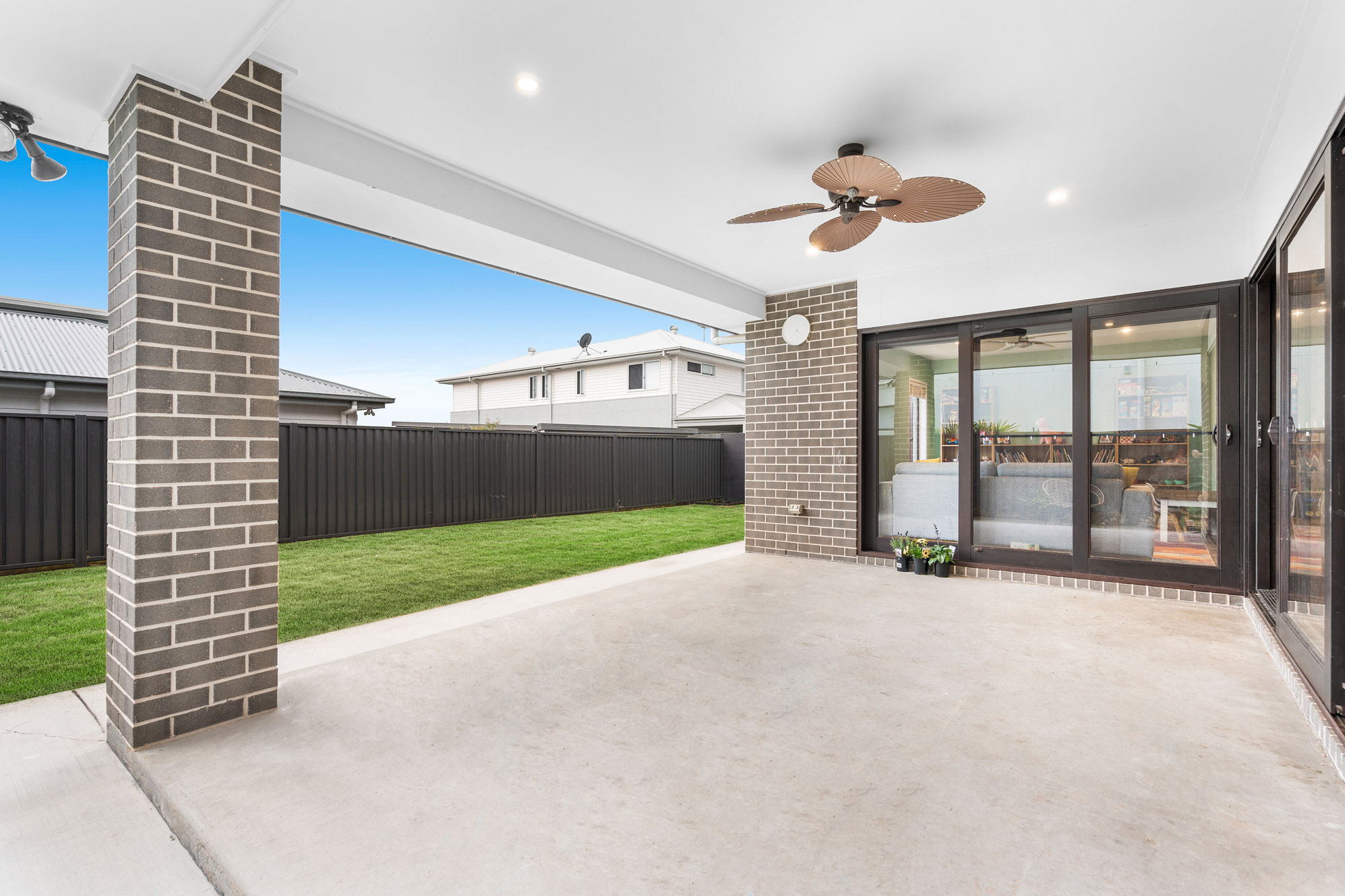 – covered outdoor entertaining space with ceiling fan