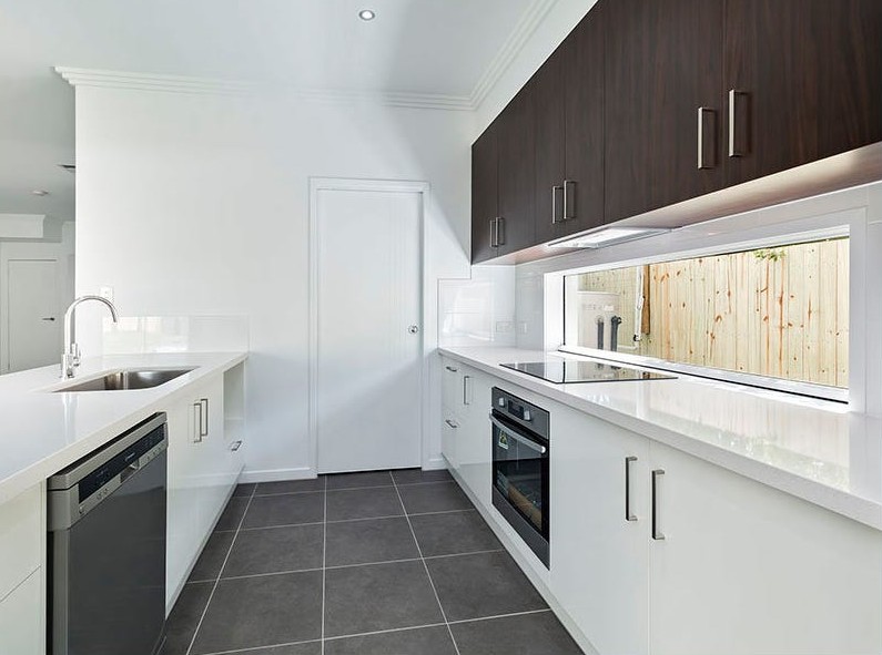 – Designer kitchen with stone bench tops, stainless steel appliances including electric oven & ceramic cooktop, and stainless steel dishwasher.